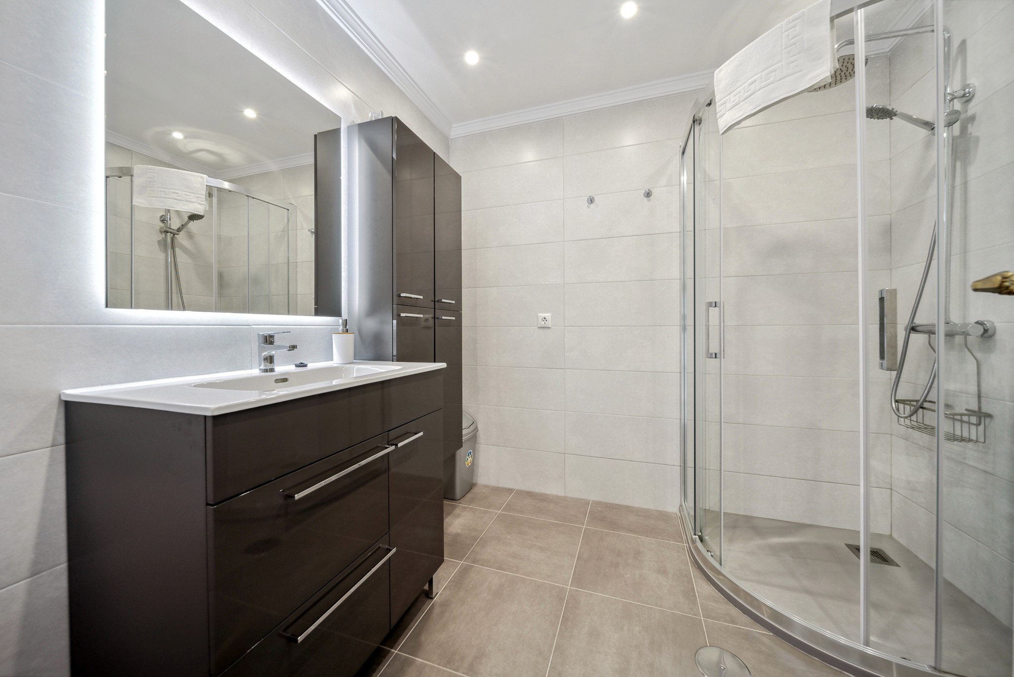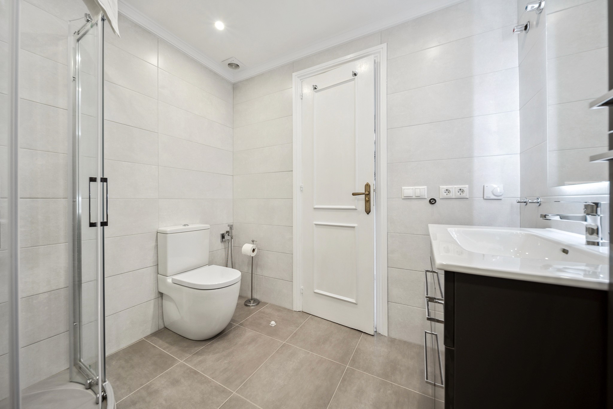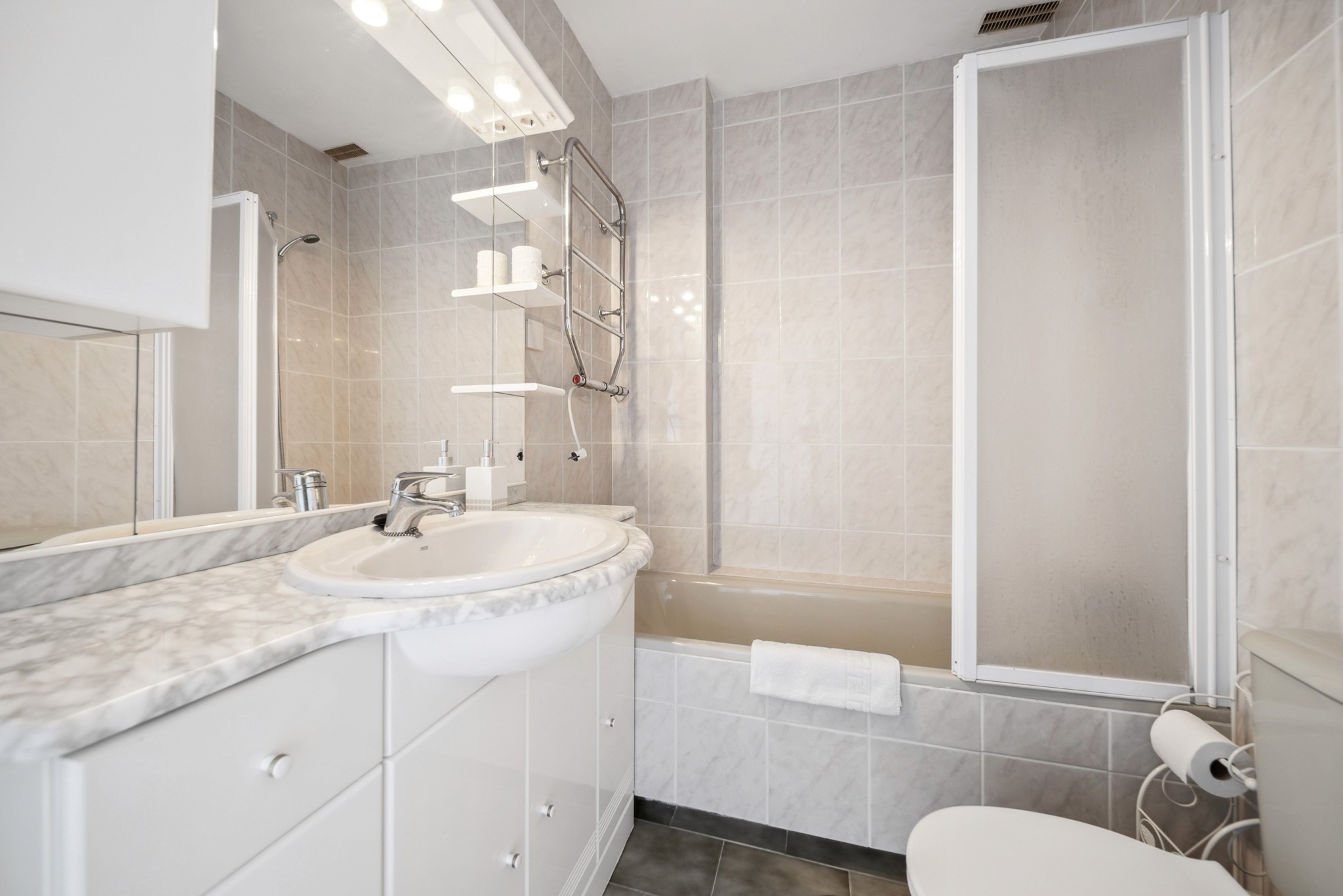 • To bad: Leiligheten har to moderne bad. Ett av badene ble nylig oppgradert med stilrene, mørke elementer, mens det andre har badekar.