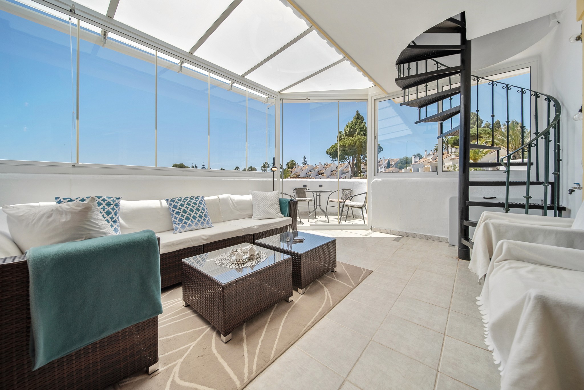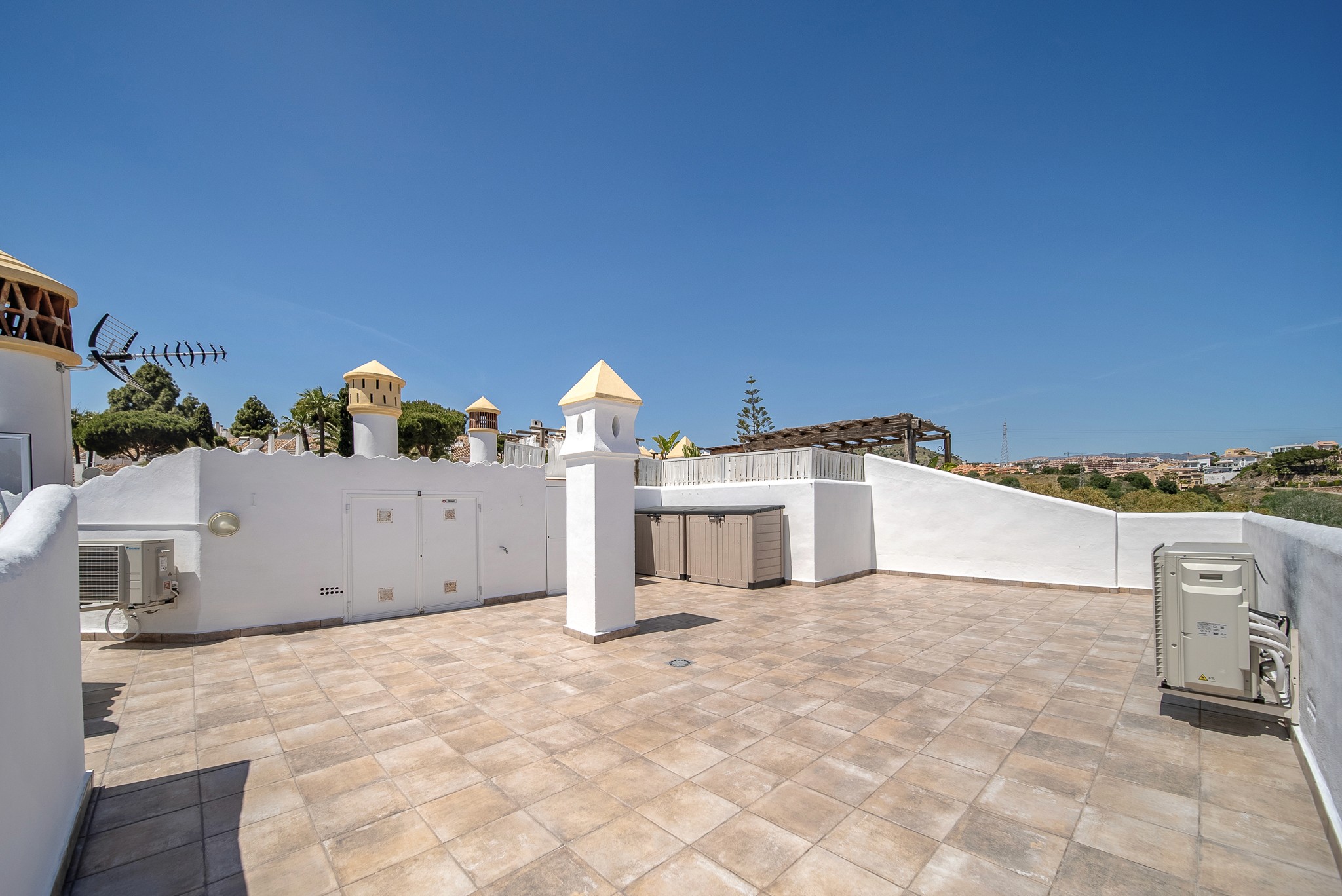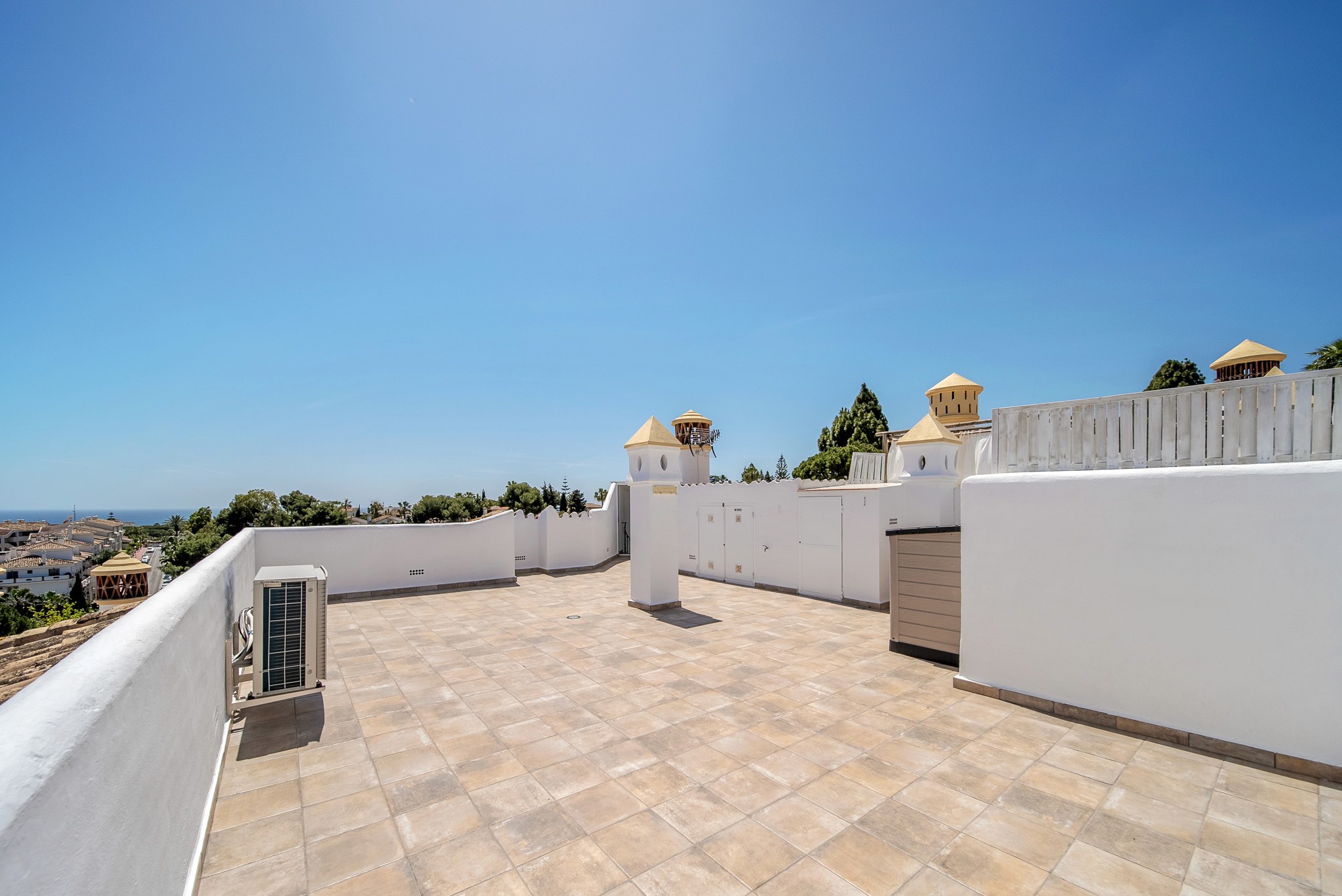 2. Takterrasse: En privat oase på nesten 60 kvm i toppetasjen! Her er du helt usjenert og kan nyte sol hele dagen. Utsikten byr på glimt av Middelhavet. På taket finner du også et uttrekkbart spisebord og et eget rom for vaskemaskinen – ideelt for tørking av klær i solen.