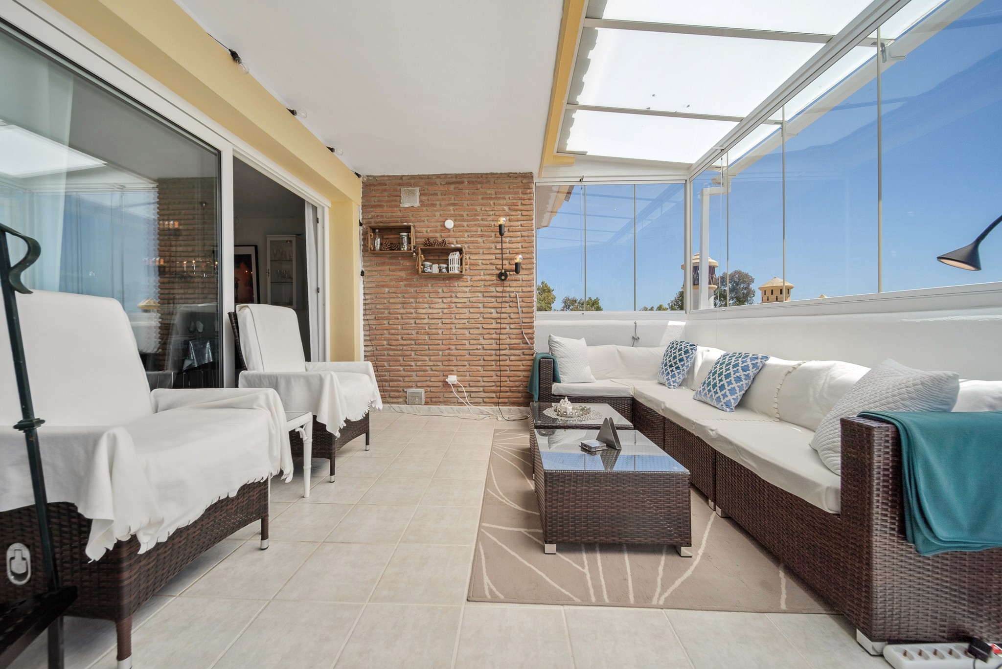 1. Innglasset veranda: Eierens personlige favoritt! Denne kan brukes hele året og har glassgardiner som kan skyves helt til side, slik at du kan nyte sol og varme som på en åpen balkong. Her har du morgensol og plass til spisebord/kosehjørne.