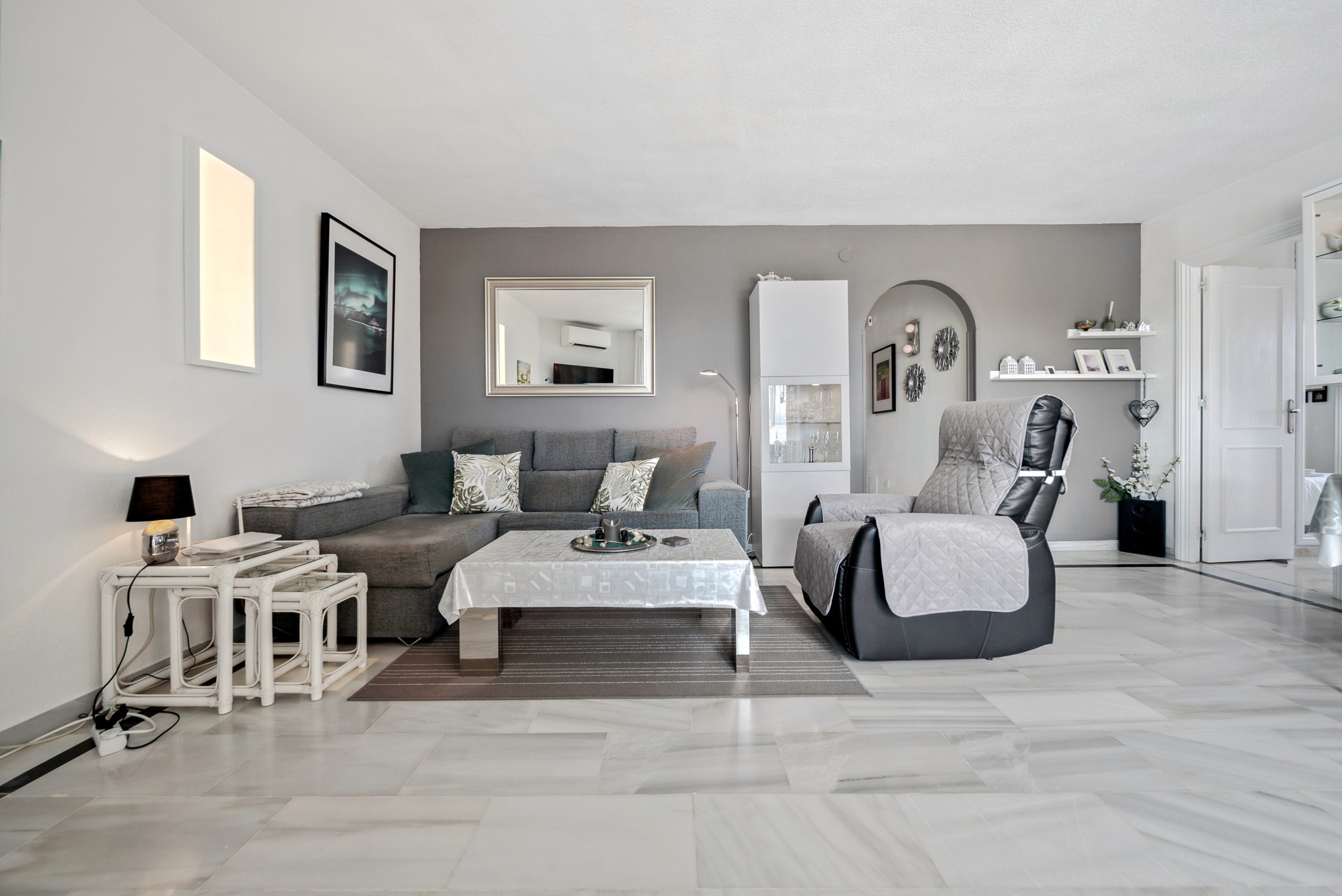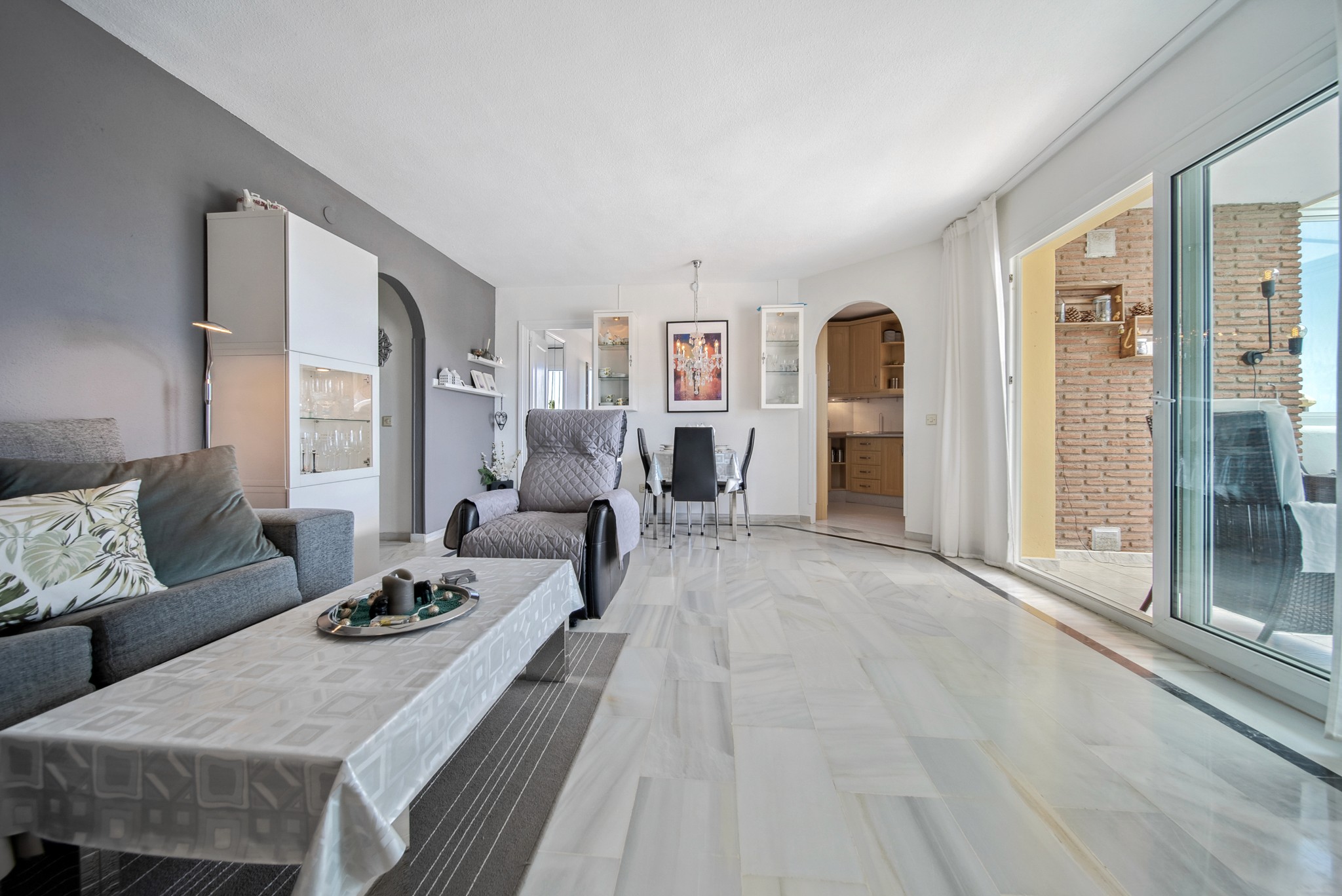 • Lys og luftig stue: Romslig stue i åpen løsning med spisestuedel. Her er det lagt vekt på en lys atmosfære, og gulvene er belagt med fliser. Ny varmepumpe/aircondition sikrer en behagelig temperatur hele året. Stuen leder direkte ut til den innglassede verandaen.