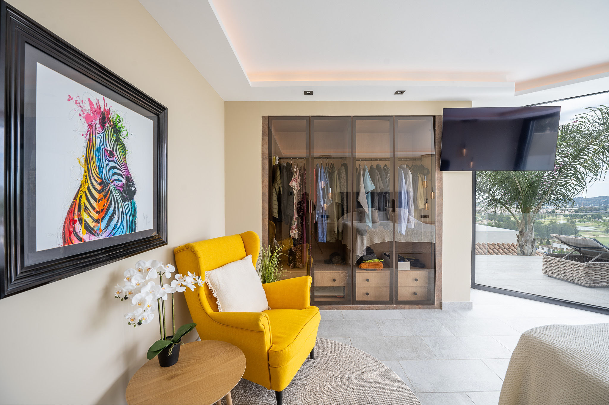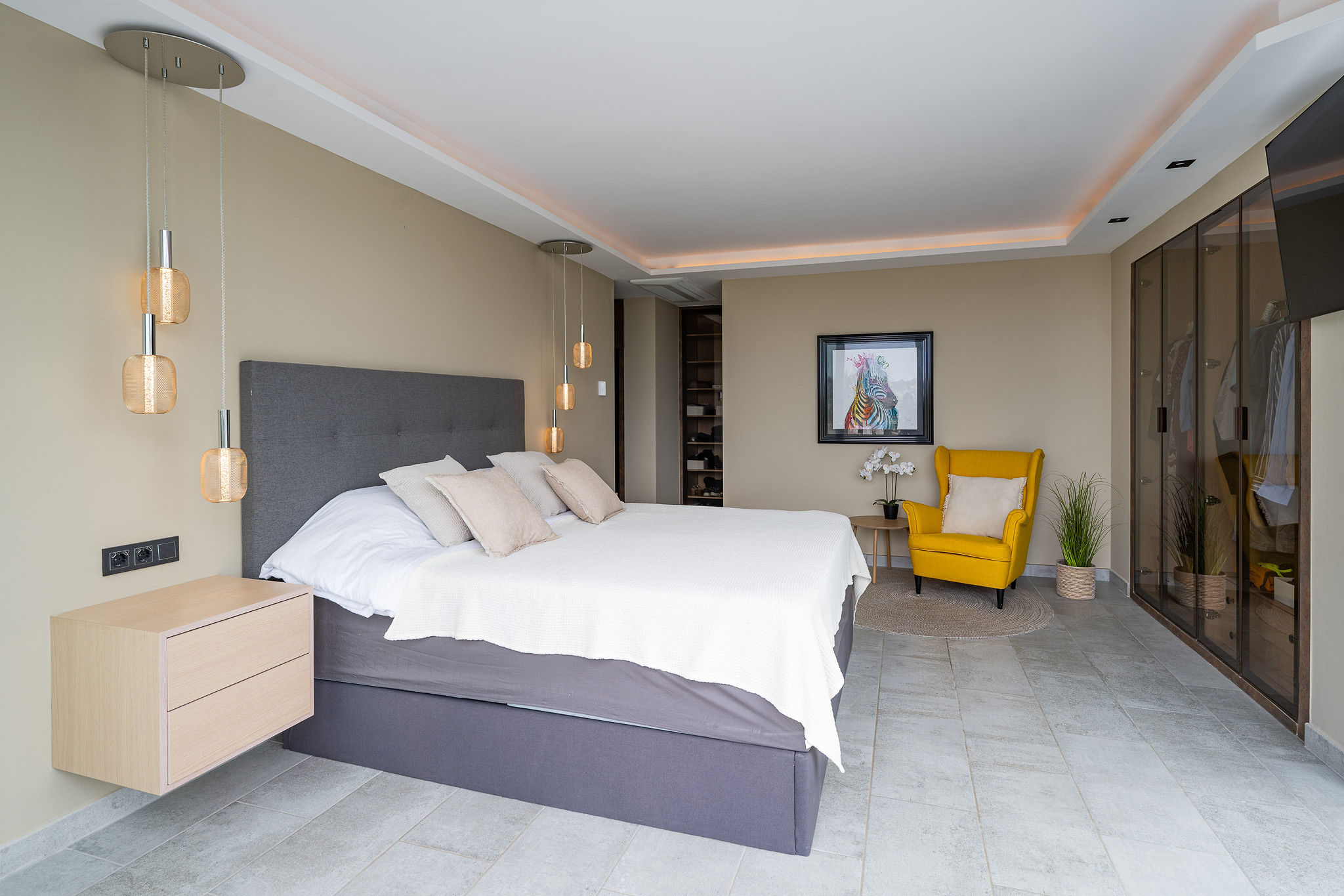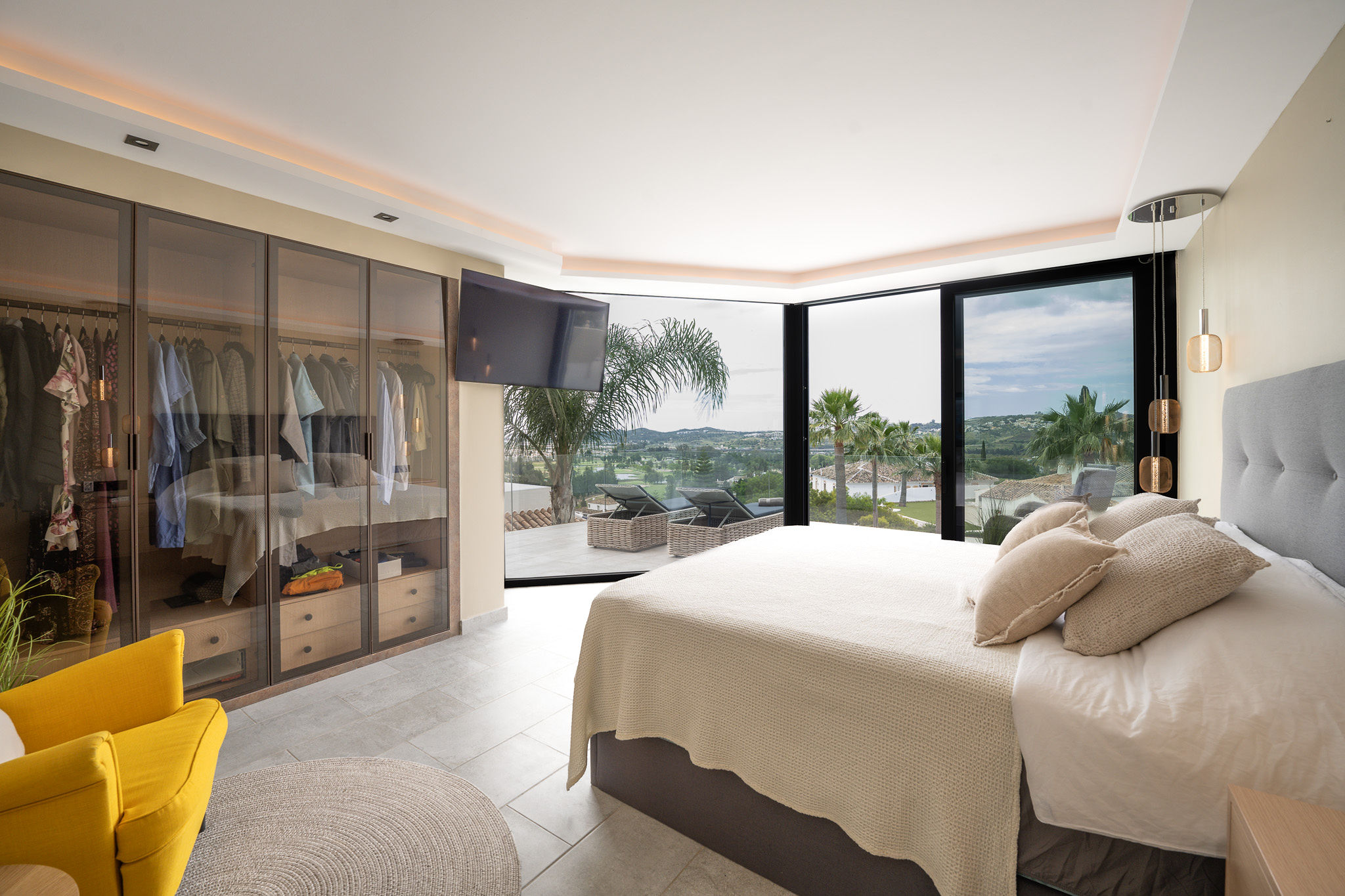 Master Suite: Plassert i andre etasje med egen privat terrasse, fantastisk utsikt og rikelig med garderobeplass.