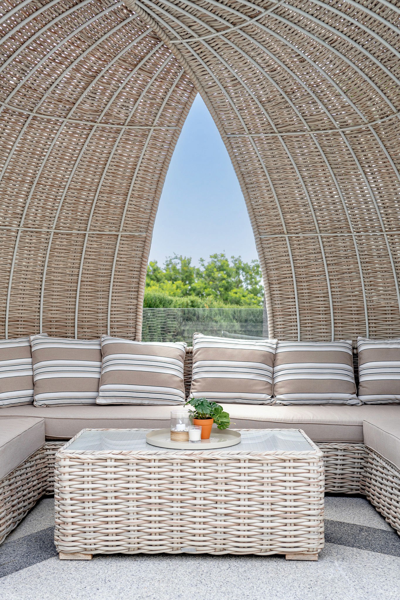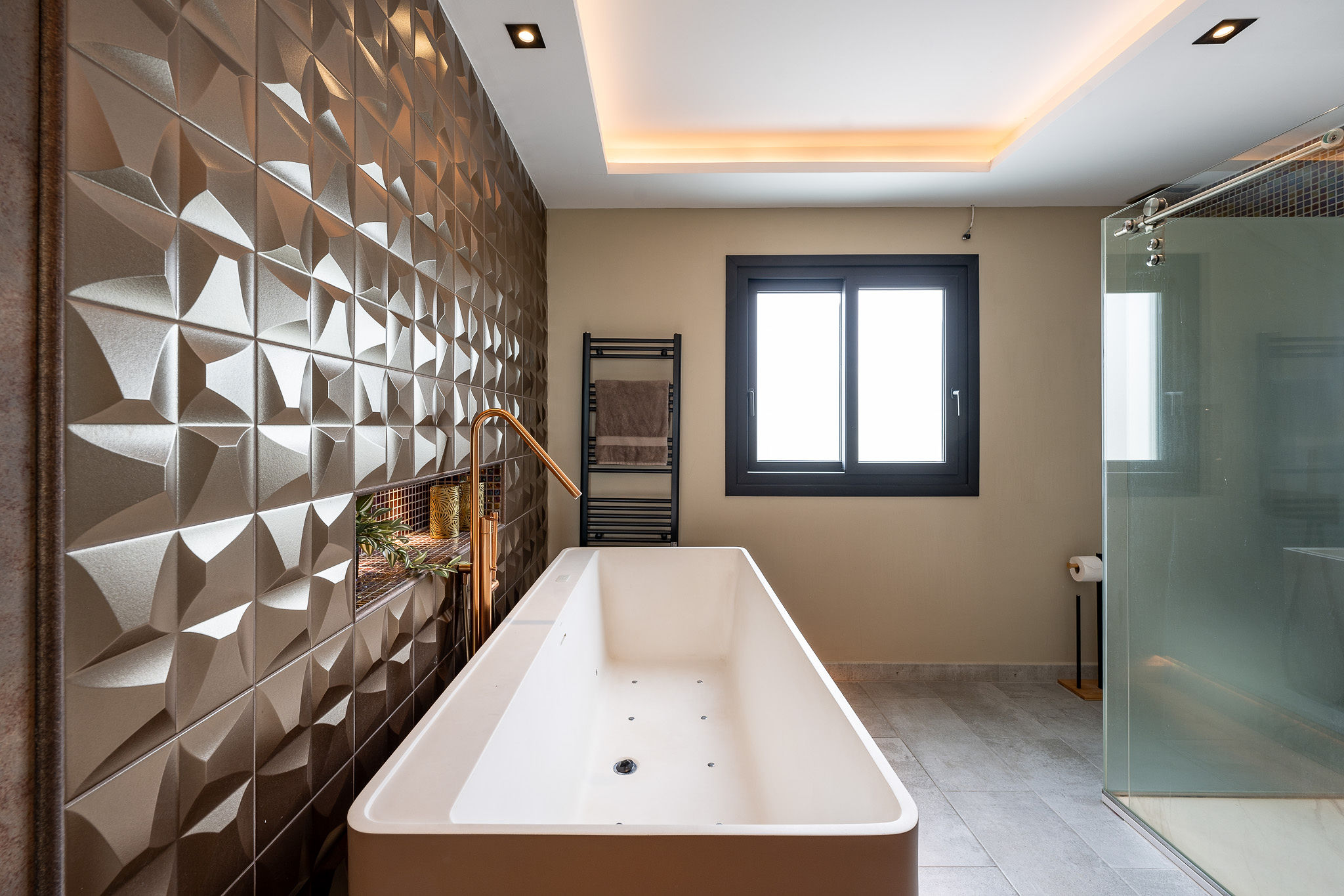 Bassengområdet: Et stort, privat svømmebasseng omgitt av en lekker terrasse med solsenger og lounge-møbler. Her finnes også utedusj og eget toalett.